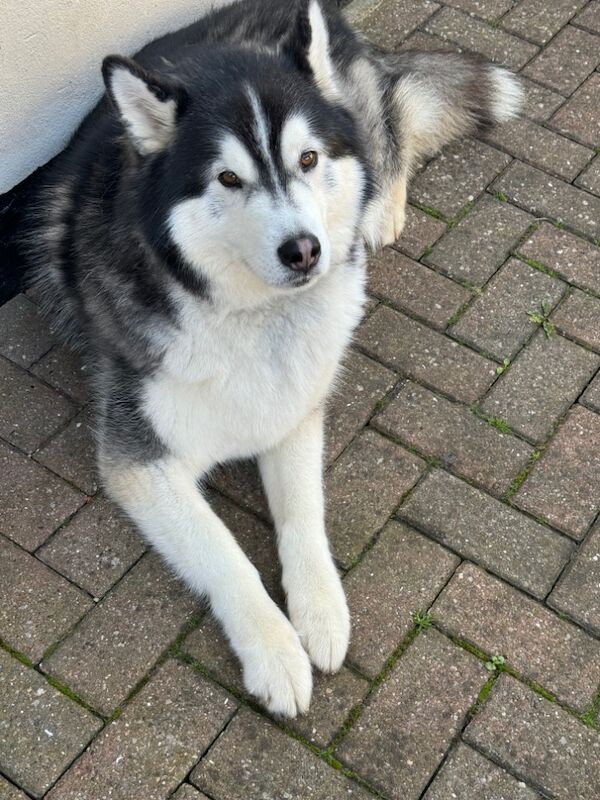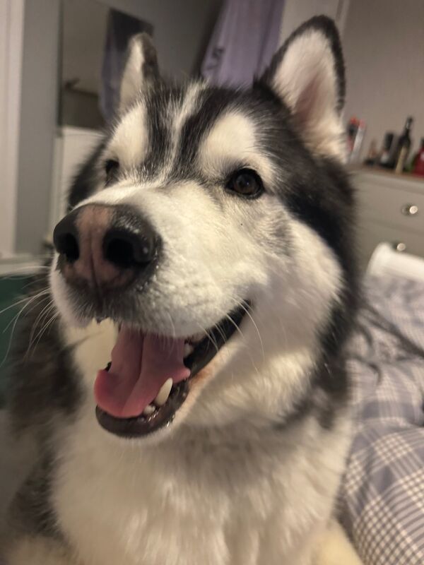 32 year old female Siberian Husky. Currently lives with 4 children but feel she would be suited to a house with older children only. She is currently the only pet in the house. She loves being in the garden and snuggling on the sofa. Shes fully house trained but is very strong on the lead when going on walks. Due to a relationship breakdown I can no longer care for her the way
